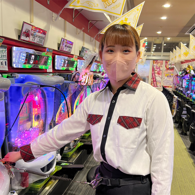 福室さんはパチンコの裏詰まり対応中にキャリーアダプターが破損しているのに気付き、私をインカムで呼びました。交換しなければならない状況でしたが、福室さんは私に対応を代わるのではなく、自分で対応するために、ホール要員として私を呼びました。福室さんにとって初めての交換作業でしたが、最後まで一人でやり遂げることが出来、次はもう少し早く出来ると思います、と自信にも繋がった様でした。初めてに挑戦し、成長へと繋げた福室さんに「こんなもんじゃない!」です。