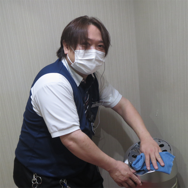 クリーンスタッフさんが退勤された後、喫煙室の清掃チェックをしていた木村さんは机をどかして落ちている吸い殻を拾って下さっていました。中には火を消さないで放ったようなものも見つかり、インカムでその状況の報告と注意喚起をして下さいました。木村さん自身も万が一火事になった際に備えて、消火器の設置場所の再確認をしていました。一つの事から先の事を想像し、それに備えようとする姿は正にベテランクルーだなと改めて感じました。「こんなもんじゃない!」です。