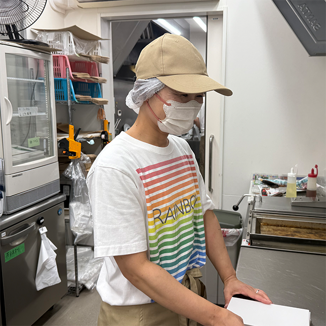 今日は一緒におむすびの製造をさせていただきました。作業が終わる都度、報告すると渡邉さんは「ありがとうございます」と言ってくれます。まだまだ物足りない人工の私にも、常にその言葉を伝えてくれ、私自身も真似しよう!と思える素敵な行動です。「元気配り」です。