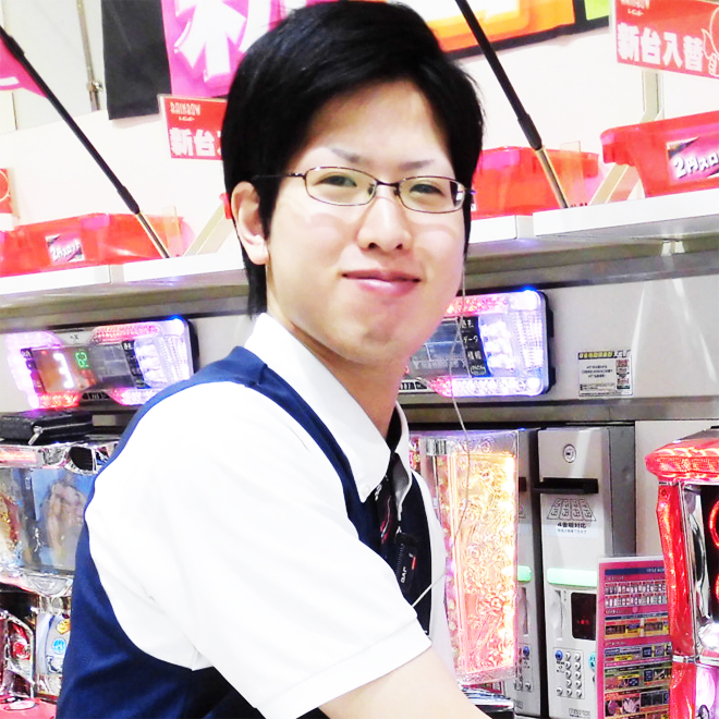 遅番の時間帯、2コースの海物語で、ユニットから玉が出ないトラブルがありました。山口さんはその様子を見て、すぐに異物詰まりだと気付き、対応に少し時間が掛かってしまう事を丁寧にお客様にお断りを入れた後、インカムで皆に伝え、対応に入りました。トラブル解決には、およそ15分を要し、なかなか手間の掛かるトラブルだった事が分かりました。何よりも素晴らしかったのは、そのトラブルを無事解決出来た事より、終始お客様の事を気に掛け、丁寧に対応した山口さんの姿勢とそれにより、長時間の処置であったにも関わらず、待たされた事に対して一切の文句も言わず、深々とお辞儀をして笑顔でご遊技を再開されたお客様の胸が熱くなる様なワンシーンでした。山口さんのお客様を大切に思い、一生懸命仕事に取り組む直向きな姿勢が「心とこころがつながる瞬間」を生んだのだと思います。