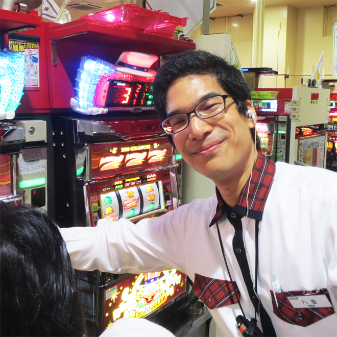 普段、遊技サポートを頼まれるお客様で、以前は木部さんが良いとご指名していた方がいらっしゃいました。八巻さんが何度も対応するうちに、八巻さんを拒否したりすることもなくなり、笑顔でお話しする様子もみられ、そのお客様も「八巻さんで」と指名してくれるようになりました。八巻さんがめげずに何度もトライし、お客様と打ち解けたからだと思いました。『心とこころがつながる瞬間』です。