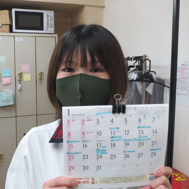 1月から景品管理担当になる土屋さんは、ミニカレンダーに景品の下げ日を記入し、引継ぎで使用しているPCの目の前の壁に掲示してくれていました。自分の担当が終わったとしても、後に続くクルーがやり易いようにと考えて行動してくれた土屋さんに「ALL RAINBOW」を感じました。